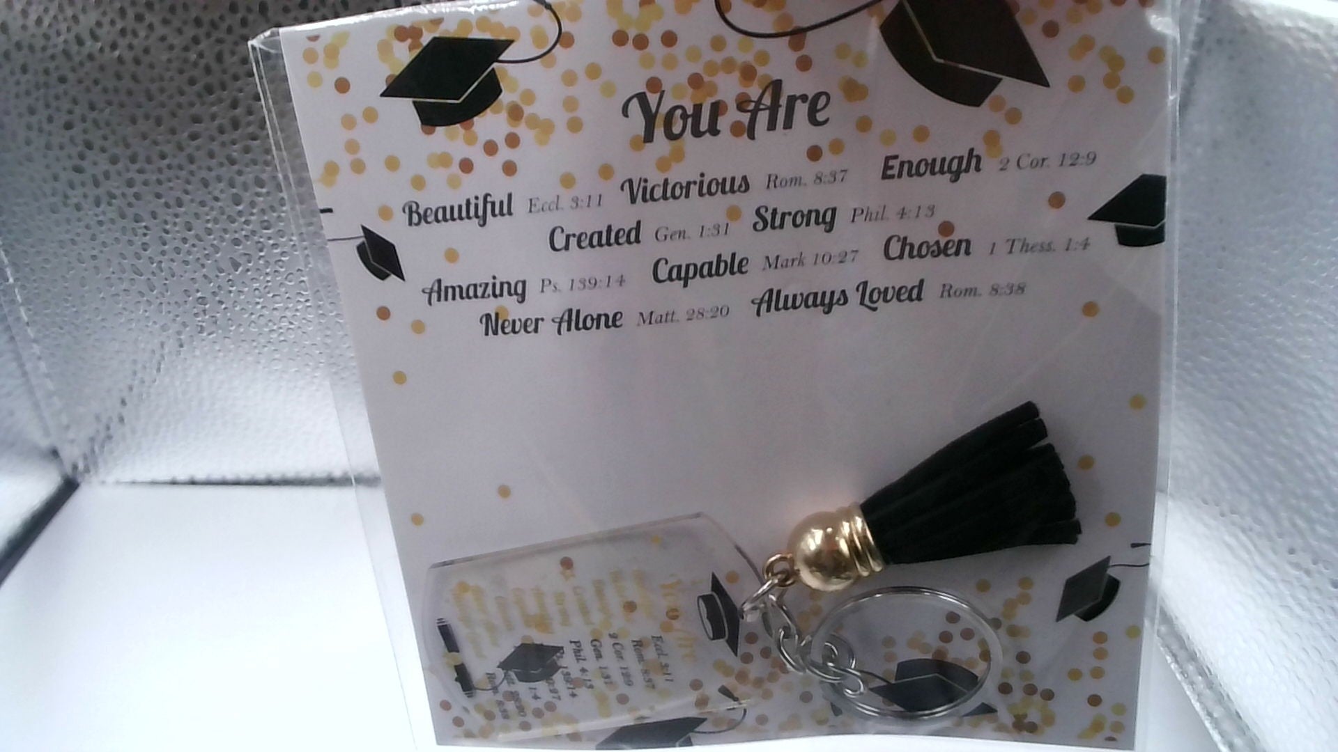 Celebrate your graduation with this beautiful inspirational keychain featuring a clear dog tag with uplifting messages. The dog tag displays the empowering words: 'You are beautiful, Victorious, Enough, created, capable, chosen, never alone, always loved.' Perfect as a graduation gift or personal reminder of your achievements and worth.